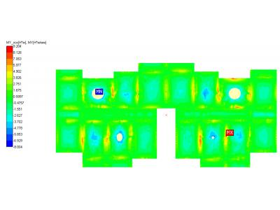 The estimated model home designed according the data provided by the customer and was modeled using rod and shell finite elements. The main part of the building (walls and floors) are a wooden frame (glulam) with cavities filled with non-combustible mineral board. Frame from the outside and inside of it is sheathed cement particle board (DSP) of different thickness. Instead, the DSP can use object-strand board (OSB). House foundation tape precast concrete.