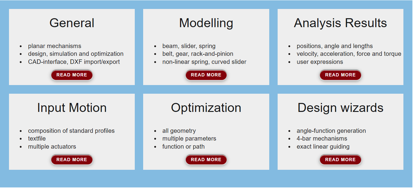 Design, motion/force analysis and constrained optimization of linkage mechanisms and drive systems.