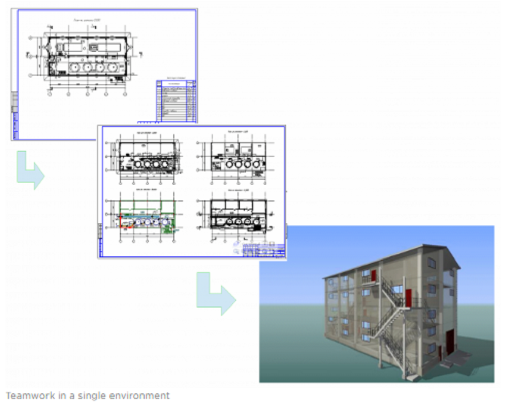 MinD technology provides the opportunity for teamwork on a project. When the architect worked out floor plans or technologists completed the layout of the equipment, then related specialists can take ready-made plans for further development of the structural part or as a substrate for the design of engineering systems. The basis of teamwork is a special team that allows you to use the basic drawing in the next stages of the project, and when it is changed, all project participants receive notification of new conditions.